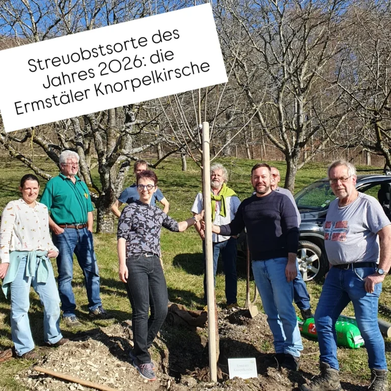 In der Obstanlage des OGV Dettingen wurde heute eine Ermstäler Knorpelkirsche, die Streuobstsorte des Jahres 2026, gepflanzt.