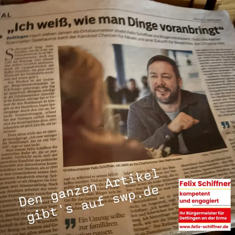Eine starke Gemeinde wie Dettingen braucht eine Verwaltung, die nah an den Menschen ist - erreichbar vor Ort und online digital im Netz. Entscheidungen müssen zügig, transparent und nachvollziehbar getroffen werden. Die Gemeindeverwaltung soll einen Service bieten, der sich den Problemen annimmt und Bürgerinnen, Bürgern sowie Unternehmen eine echte Unterstützung bringt.