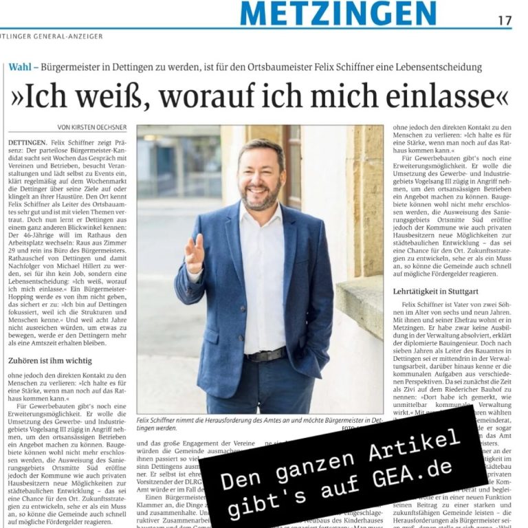 ich kandidiere für das Amt des Bürgermeisters von Dettingen an der Erms, weil sich Dettingen lohnt. Dettingen lohnt sich, weil hier eine Fülle an Menschen leben, die sich an unterschiedlichster Stelle vielfältig und engagiert einbringen. Immer verbunden mit dem Ziel, dass Dettingen eine starke und lebendige Gemeinde bleibt. Das habe ich in den letzten sieben Jahren erfahren, in denen ich hier als Ortsbaumeister tätig sein darf.